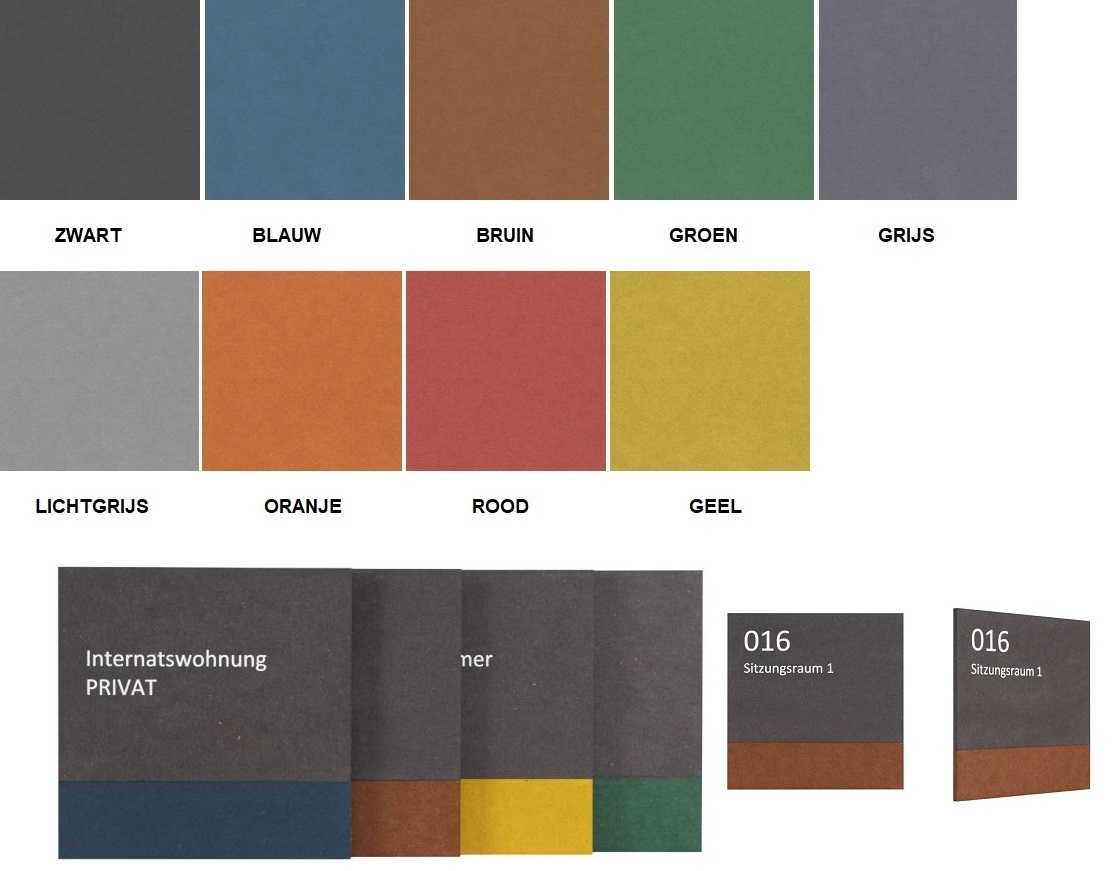 Het deurbordje WOOD milieu is een 5 mm dik geperste houten (FSC) paneel in brandklasse B1, die zijn ingekleurd met organische kleurpigmenten. Deze hebben een zijdezacht oppervlak en zijn volledig egaal gekleurd. Dit resulteert altijd in een gekleurde zijkant. Het materiaal is ook ideaal om te bedrukken, te beletteren, te laseren en te graveren. Dit is evenwel niet inbegrepen in de prijs. Zie voor de montage de afbeelding. Er zijn in totaal 9 kleuren om uit te kiezen, die naar wens kunnen worden gecombineerd en desgewenst door het aanbrengen van biologische olie in hun kleurintensiteit kunnen worden versterkt. Door poeder- of verfcoating bewust te vermijden, kunnen we extra CO2-uitstoot bij de productie van WOOD milieu voorkomen. Zie voor de beschikbare kleuren bijgaande afbeelding en vermeld bij uw bestelling de gewenste kleur - kleuren. Prijs voor laseren, graveren, beleteren en print tegen meerprijs.